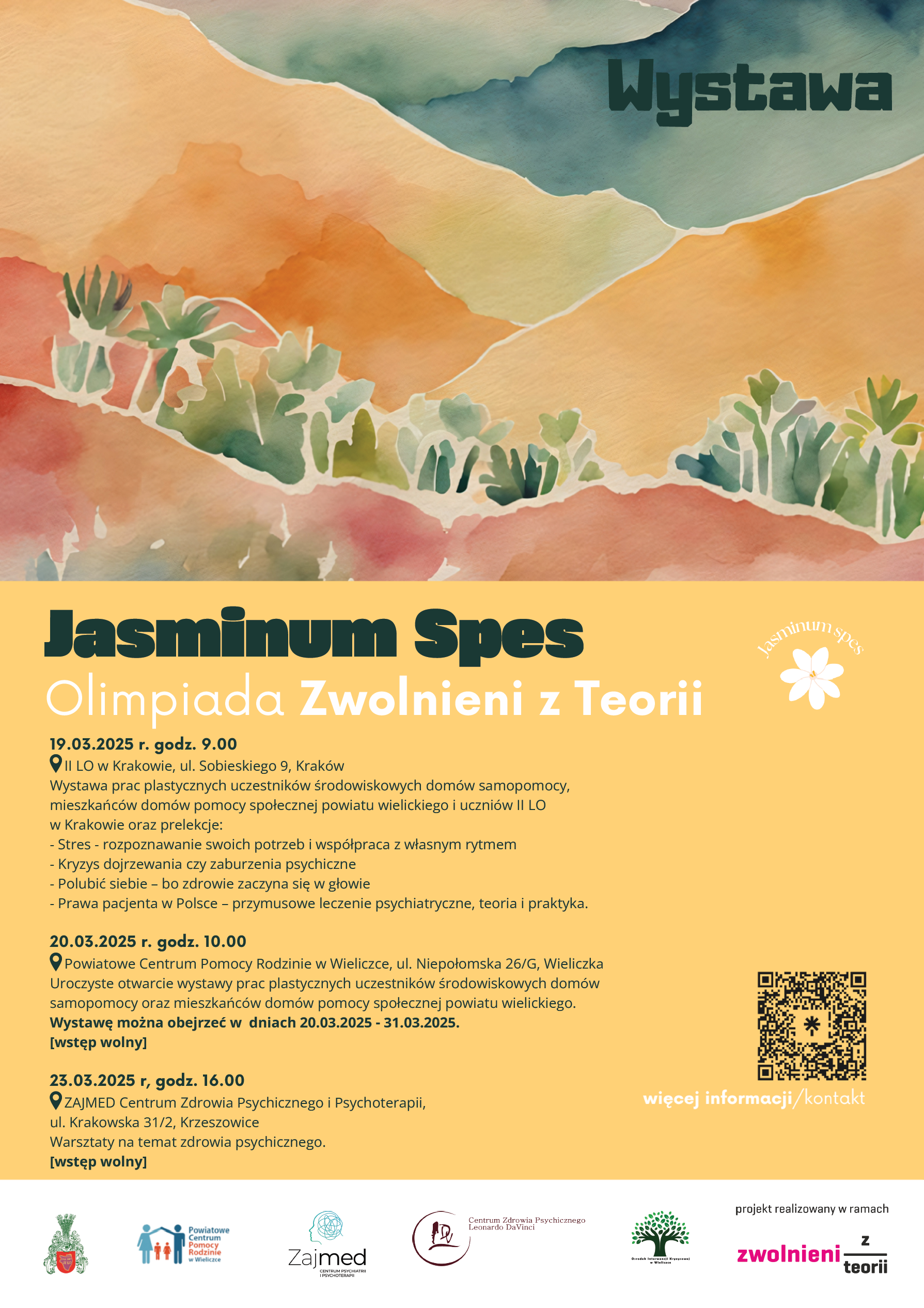 Choroby i zaburzenia psychiczne to temat, który dotyczy nas wszystkich. Czasem wystarczy jedno wydarzenie, kilka słów – tak niewiele, by zniszczyć tak wiele. Grupa młodych ludzi, uczniów II LO w Krakowie, stworzyła Projekt Społeczny Jasminum Spes w ramach Olimpiady Zwolnieni z Teorii, którego celem jest uświadamianie, wspieranie i pomaganie osobom w kryzysie psychicznym. Inicjatywa została objęta patronatem Centrum ZAJMED Krzeszowice.